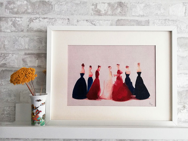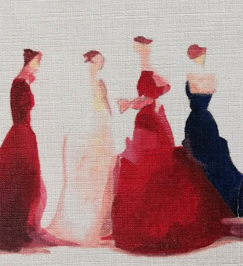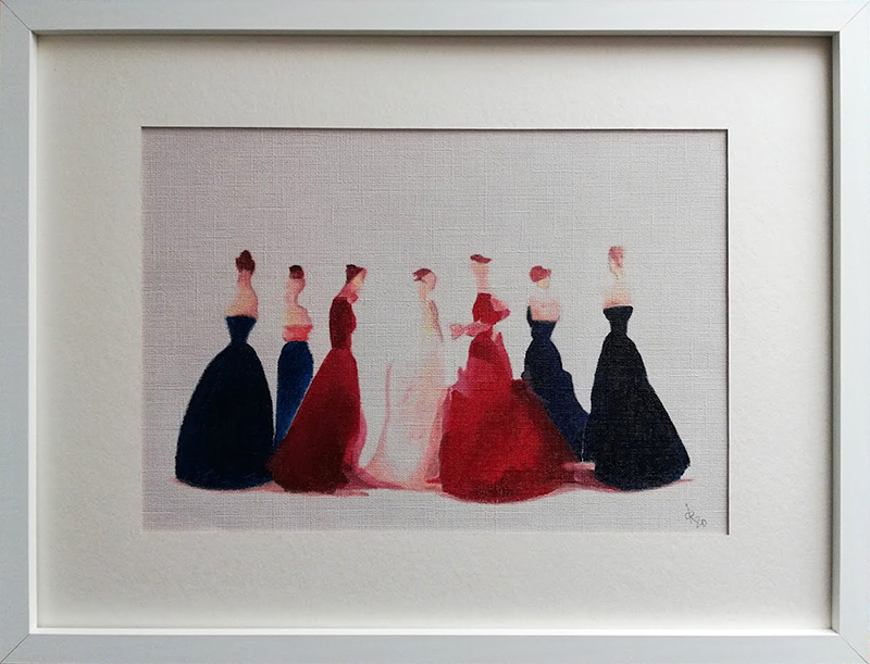 Uno de mis cuadros favoritos, aunque me cuesta elegir alguno. Sin duda una imagen que invita a soñar con los bailes de otra época. Un tanto onírica y un mucho de delicada y vaporosa. Está realizada con pintura acrílica sobre un fondo de papel pintado de color hueso y con una cierta textura en cuadrícula.