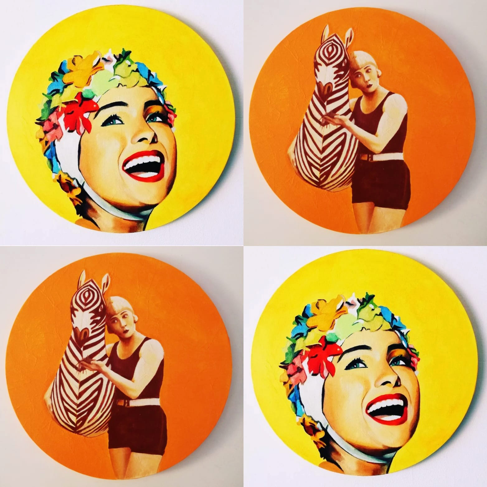 Another piece for the «Bubbles» collection, full of Vitamin C and enough power to make you smile even in the coldest winter days. I revisit one of my favourite themes, vintage swimwear. This time with a lovely zebra to keep me company. A little round canvas (dia.40cm) painted in acrylic and oil to make your day great.