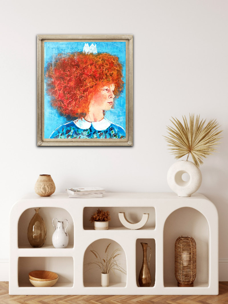 Children portraits offer me the chance to play with my imagination, let butterflies flutter around my head to perch on the dress and among the curls of this little readhead. 55×46 cm child portrait painted with a mixed media, acrylic and collage technique. A different and funny idea for a child non conventional portrait. Do you dare to dream?
