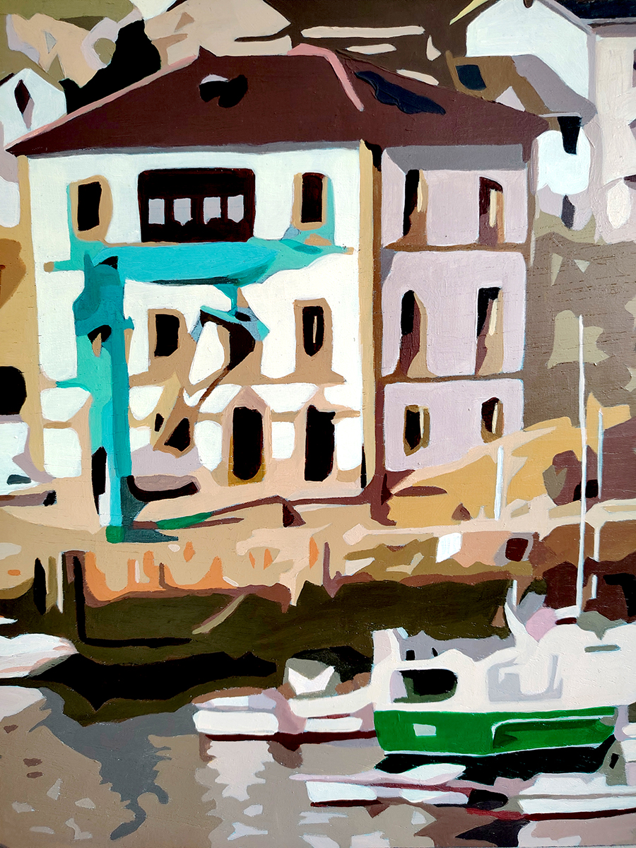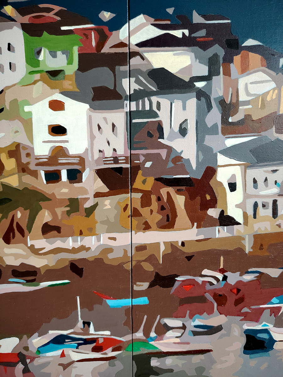 En la franja central, el caserío tapiego se despliega como un mosaico de volúmenes cúbicos. La paleta cromática es rica y contrastada: los blancos luminosos de las fachadas tradicionales conviven con acentos de amarillo, ocre y verdes intensos, reflejando la arquitectura variopinta que asoma al Cantábrico. En la parte inferior, el puerto cobra vida con una amalgama de pequeñas embarcaciones que flotan sobre aguas oscuras y reflectantes, donde las pinceladas se vuelven más dinámicas para sugerir el suave balanceo del mar y los reflejos de las barcas de pesca.