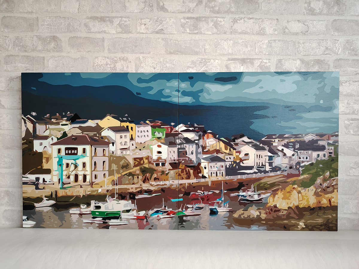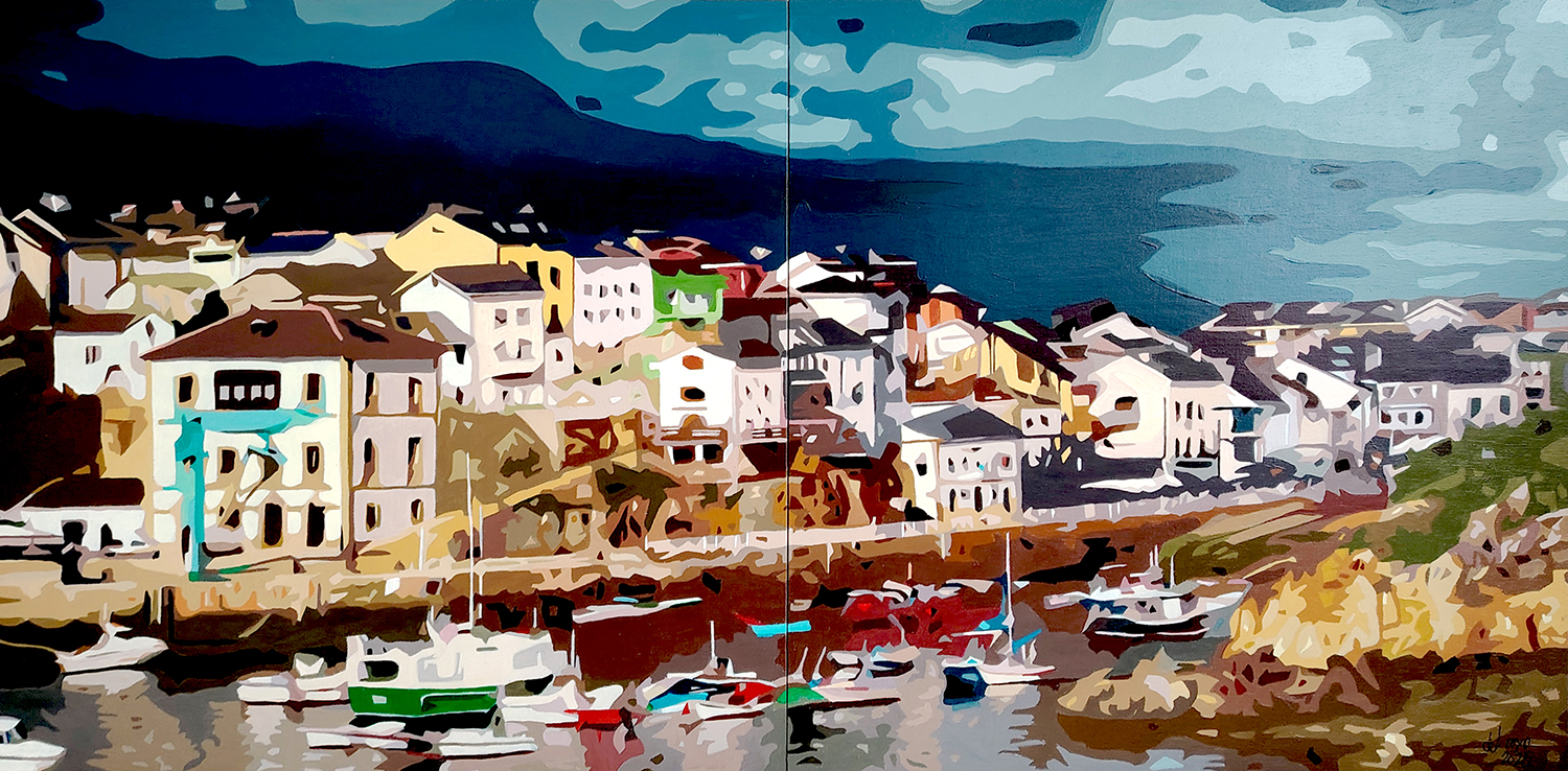 Esta obra es una vibrante interpretación del puerto pesquero de Tapia de Casariego, capturada mediante una técnica de acrílico sobre en un díptico. Con unas dimensiones totales de 100×50cm, la pieza se divide en dos bastidores de madera cuadrados que, al unirse, ofrecen una visión panorámica y contemporánea de este emblemático rincón del occidente asturiano. La composición destaca por un estilo que bordea la abstracción geométrica, donde las formas se simplifican en planos de color bien definidos, eliminando el detalle minucioso para centrarse en la esencia estructural y lumínica del paisaje costero.