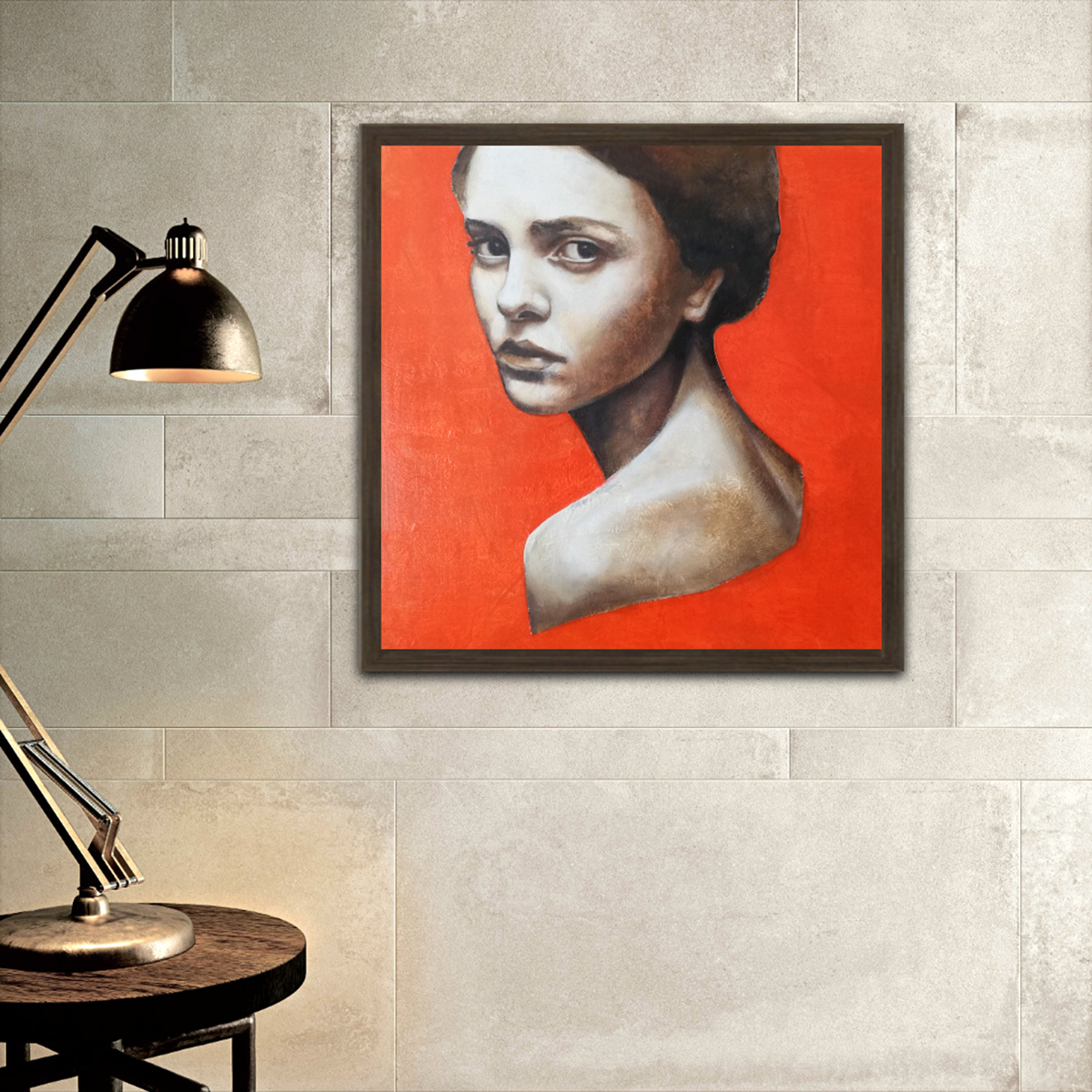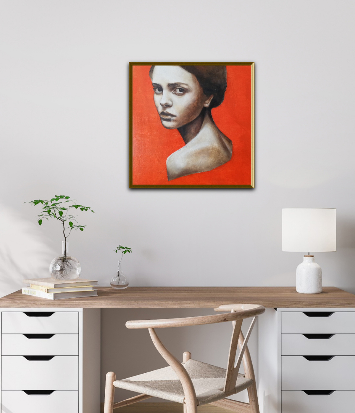 This is a vintage looking portrait in umber shades and special focus in the texture and the dazzling red vermilion color of the background. It has been painted with a mixed media technique using gesso, acrylic, charcoal and oil paint. Her name if Valentina because she was born on St. Valentine’s day.